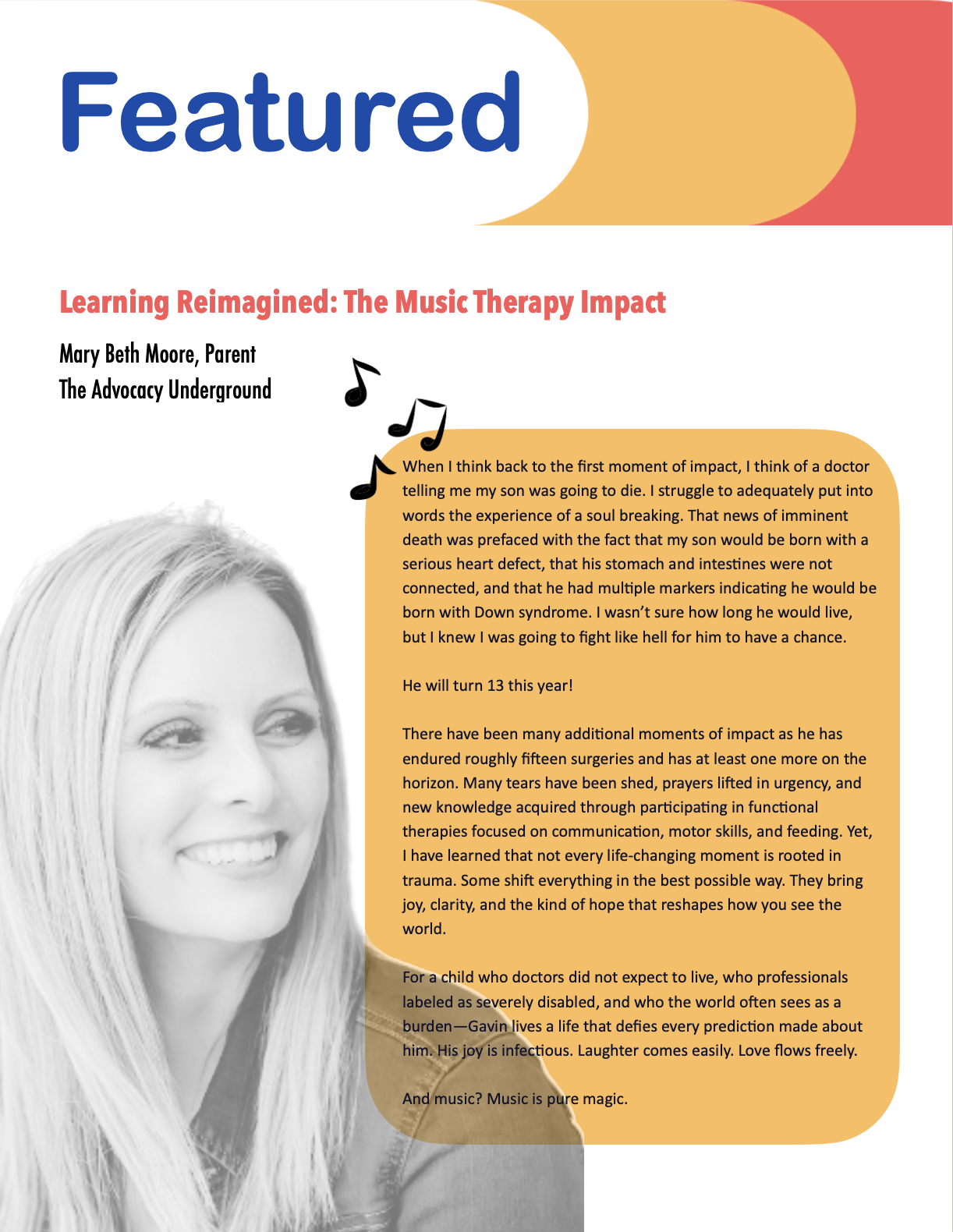 - Featured Article: Mary Beth Moore’s moving account of advocacy, resilience, and the transformative power of music therapy in her son’s journey.